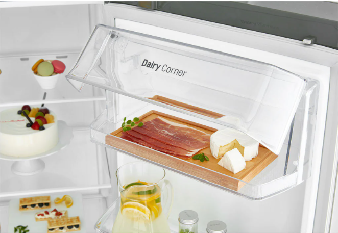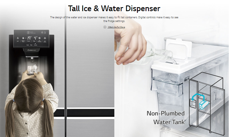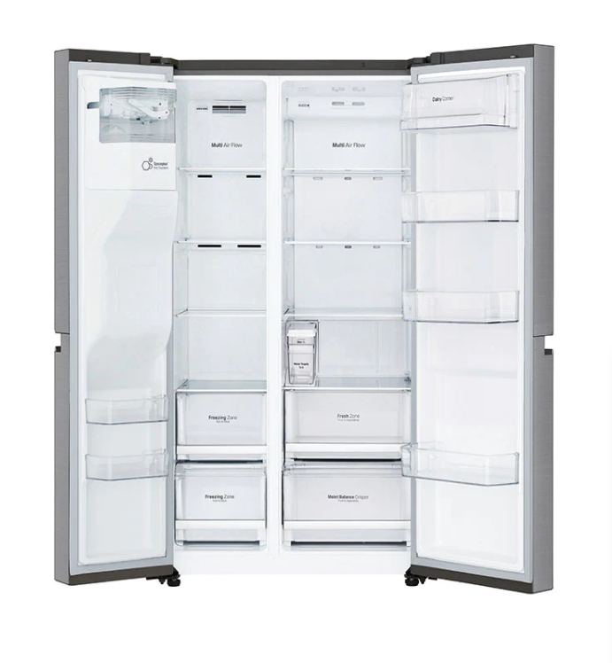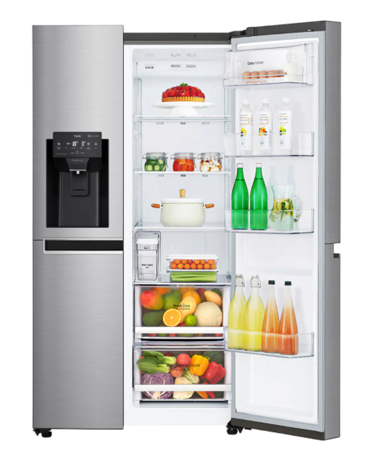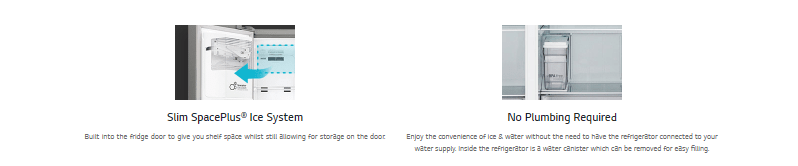 Appreciate design with this side by side refrigerator from LG. It features a chrome pocket handle and a stainless steel anti-fingerprint exterior, for cleaner living. Find extra accessibility with the slim SpacePlus ice system, designed to fit taller containers while taking up less space. Enjoy more space with the large 668-litre capacity, which is room enough to fit everything your household needs.