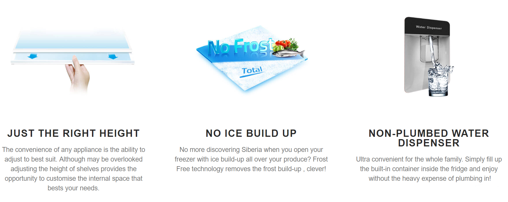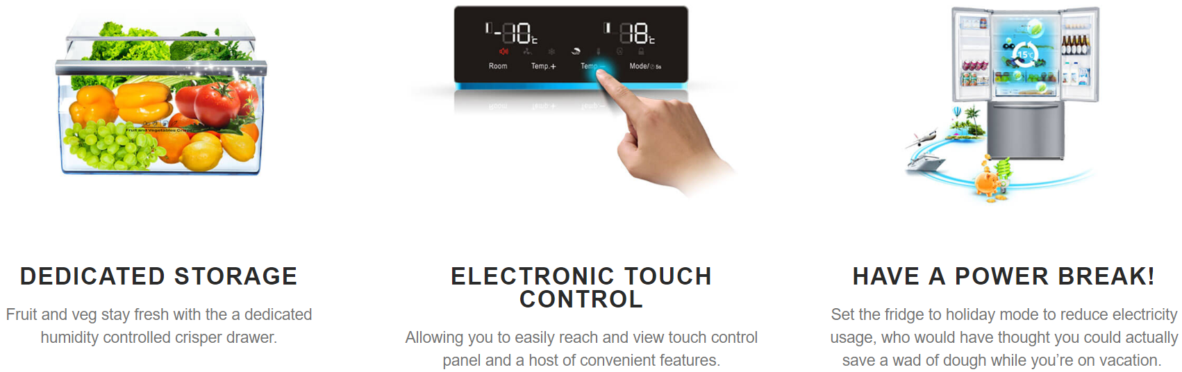The Hisense French Door refrigerator is a culmination of high technology and luxurious design. Conveying all the sophistication you’d want in today’s modern kitchen, organise family get-togethers with confidence with our 630L capacity and 800mm wide shelves. The French Door refrigerator focuses on ease-of-use and reliability with features such as a large multi-function LED touch control panel, in-door water dispenser requiring NO plumbing and 3-tier freezer drawers.