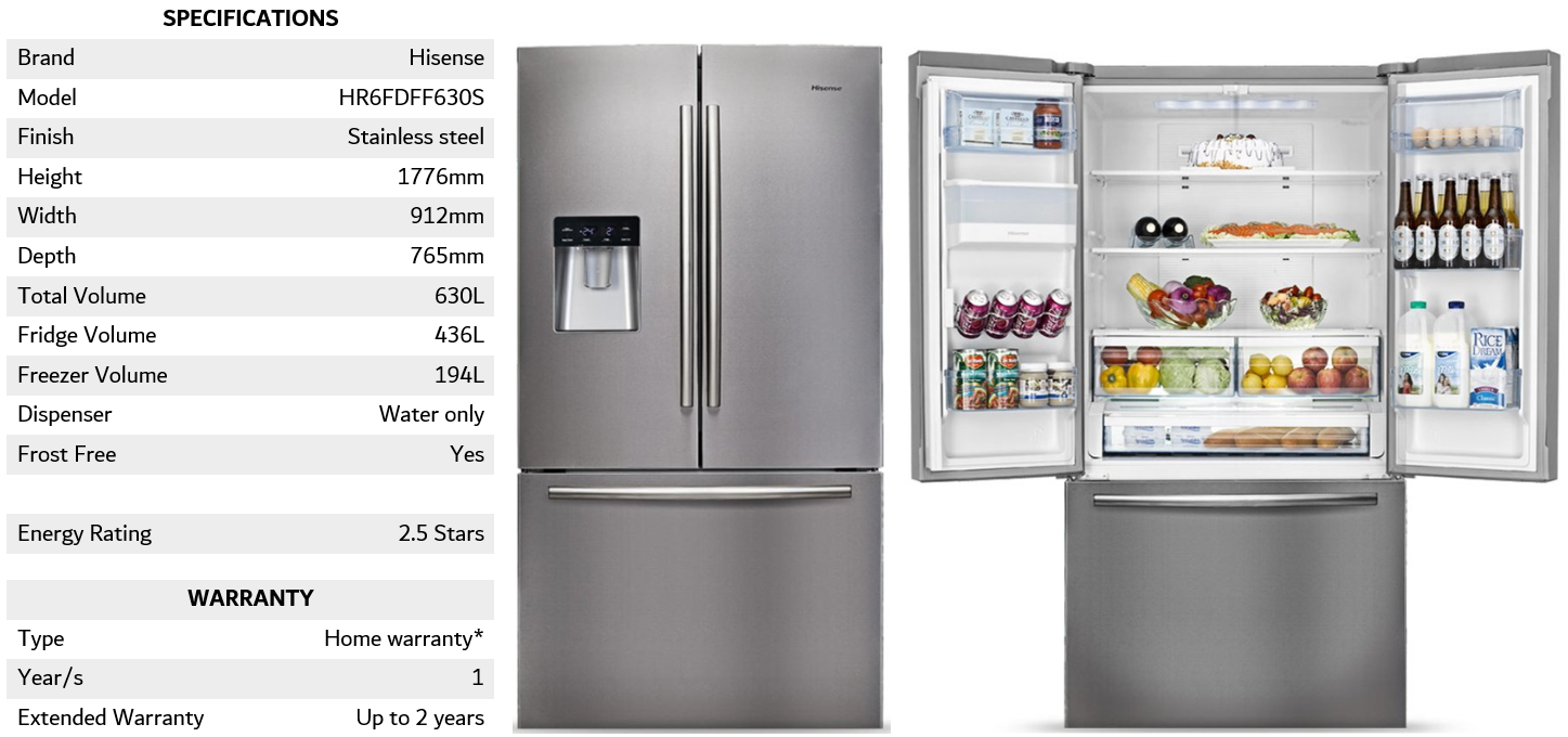 The Hisense French Door refrigerator is a culmination of high technology and luxurious design. Conveying all the sophistication you’d want in today’s modern kitchen, organise family get-togethers with confidence with our 630L capacity and 800mm wide shelves. The French Door refrigerator focuses on ease-of-use and reliability with features such as a large multi-function LED touch control panel, in-door water dispenser requiring NO plumbing and 3-tier freezer drawers.