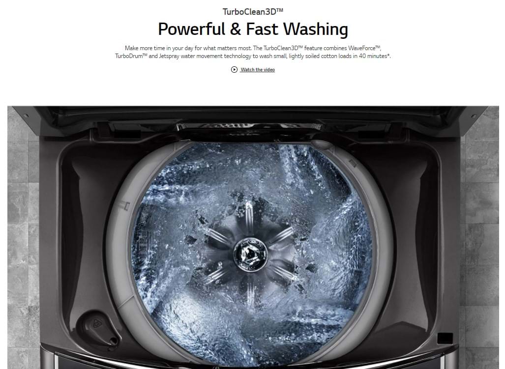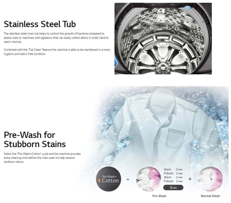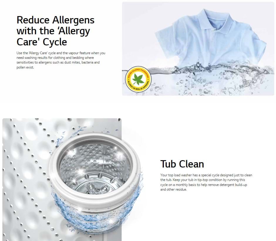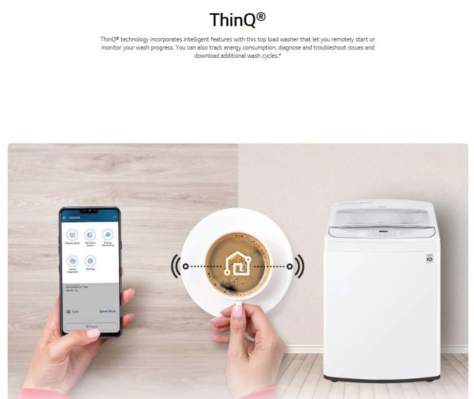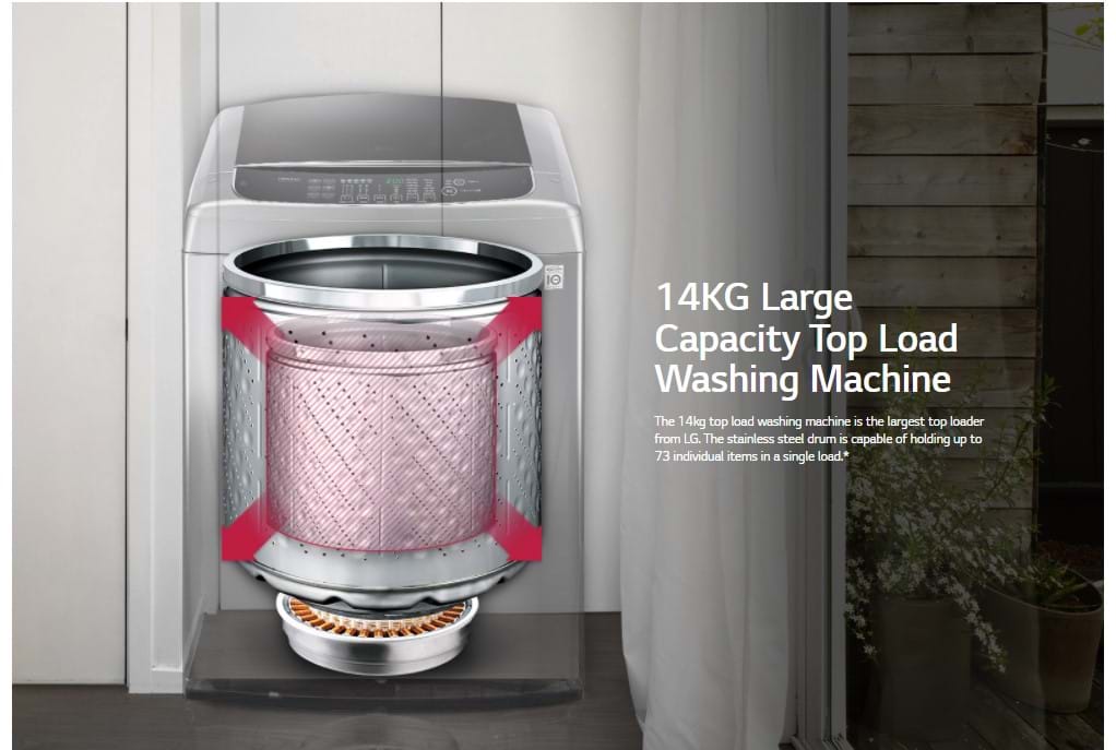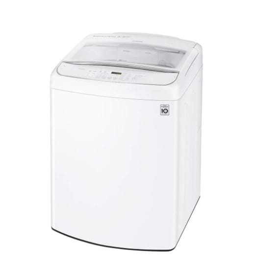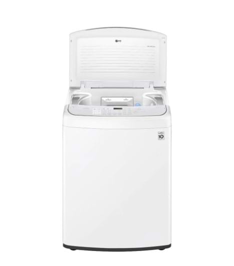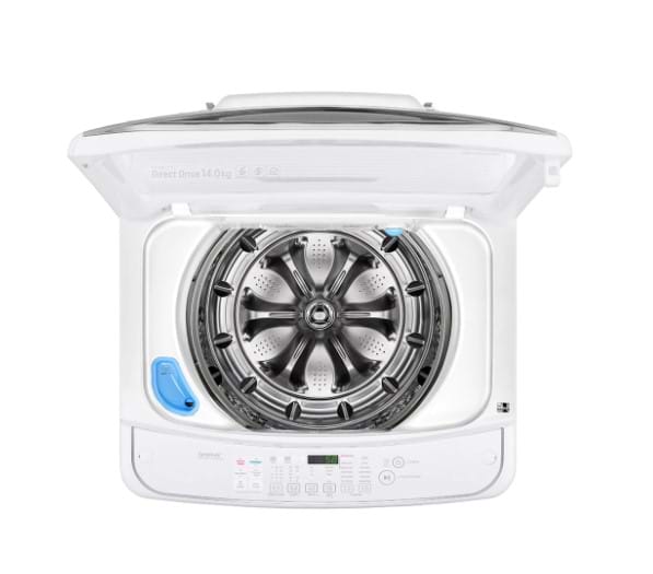 This white LG top loader washer has a high 4 star WELS water rating and a 4 star energy rating for bill savings, and the capacity to wash 14kg of dry laundry for each load so you can save money by running fewer loads of laundry for 5 or more people. It has 10 types of washing programs, so you can select the best setting for each load of washing. Plus, the white LG WTG1434WHF features a 950 rpm maximum spin speed. It's 1023mm high, 690mm wide, and 730mm deep, so take careful measurements of where your washer needs to fit, leaving space for the lid to open fully and to have a wall-mounted dryer above the open lid if you have limited laundry space.
